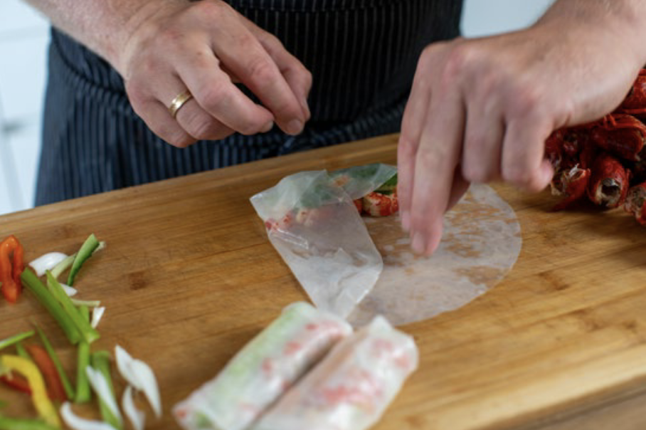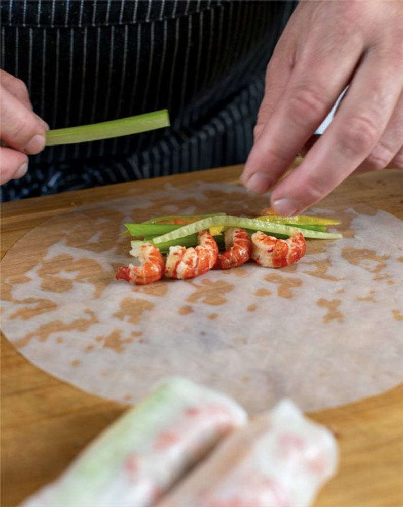 Tag et stykke rispapir ad gangen og læg det ned i et fad med vand. Lad det ligge cirka 30 sekunder. Tag rispapiret op og læg det på et stort skærebræt. Er rispapiret firkantet, lægges det med en spids ned mod dig selv. Læg nu fyld cirka en tredjedel inde på rispapiret sammen med krebse- halerne.