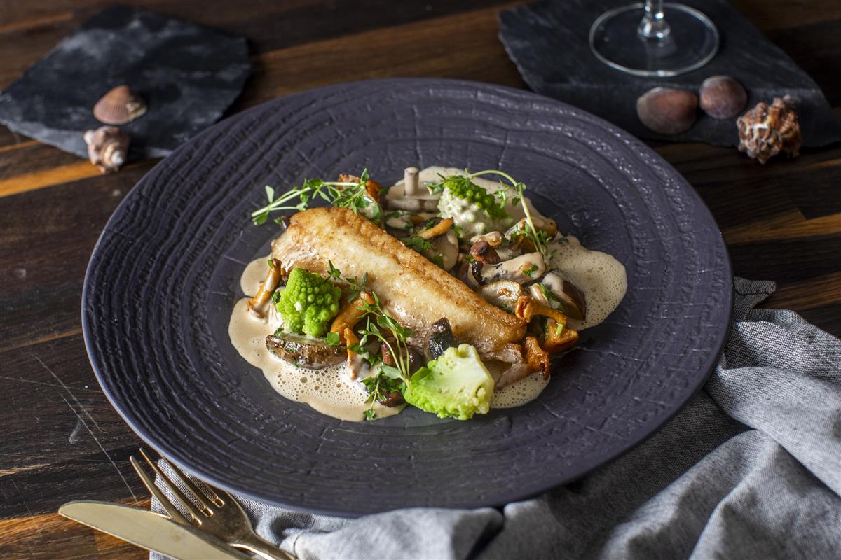 Anret fisken i midten og hæld svampesaucen rundt om. Anret buketter af romanesco og pynt med lidt timian.