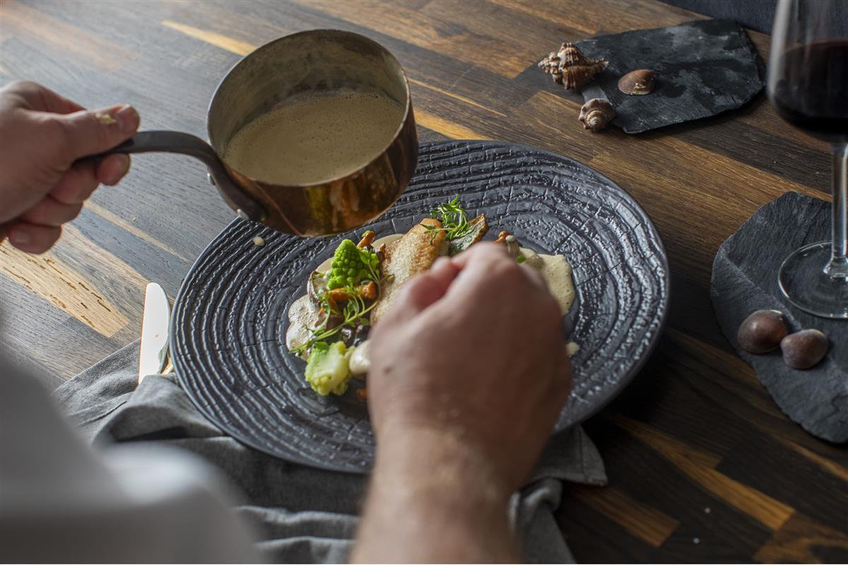 Svampene renses og ristes af på en varm pande. Hæld hønsefond og piskefløde på og smag til med salt og peber. Del romanesco i små buketter og damp dem ganske let, så der stadigvæk er bid.