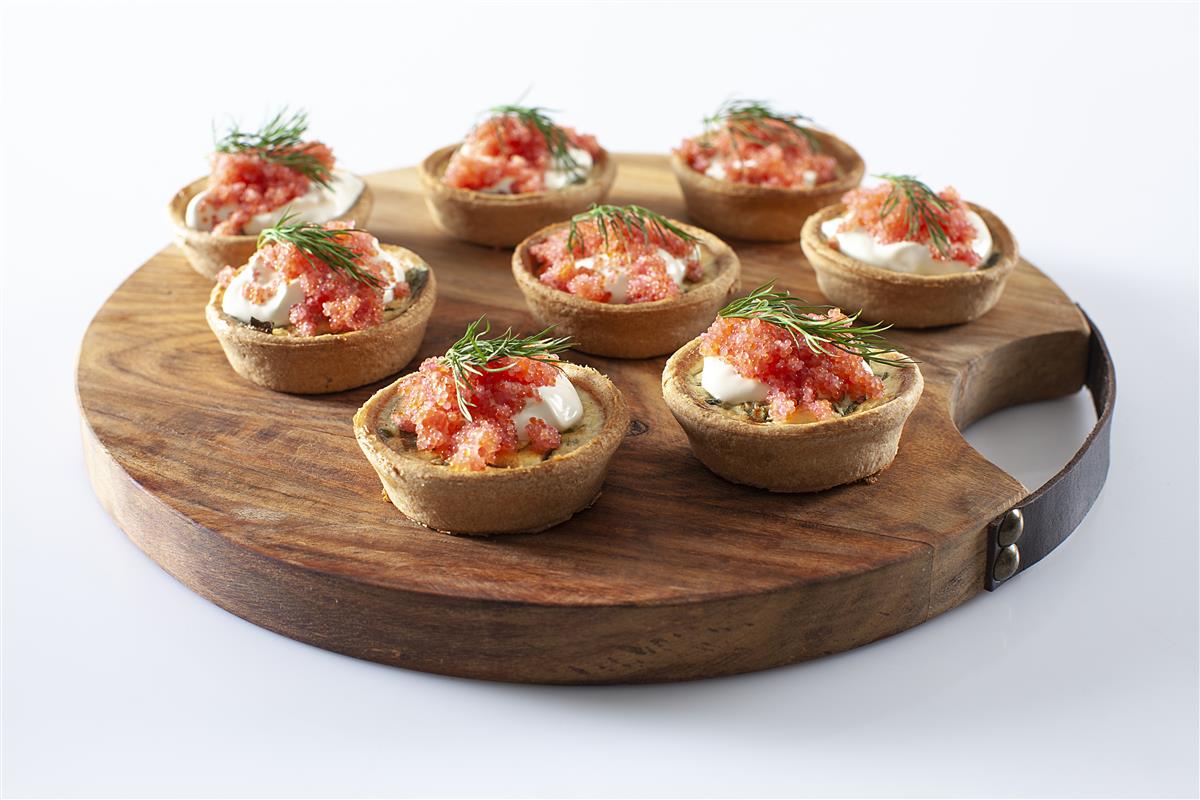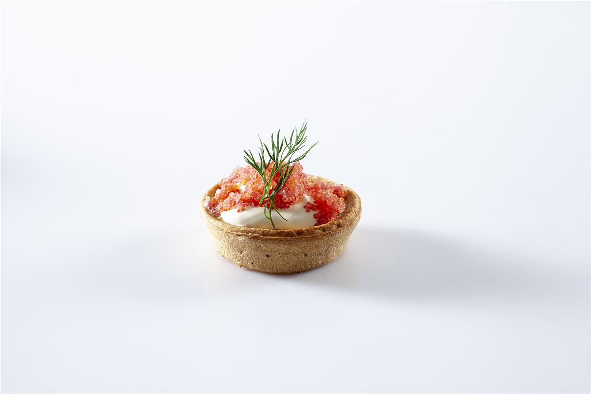 Server de lune eller kolde miniquiche. Pynt med stenbiderrogn, creme fraiche og lidt frisk dild.
