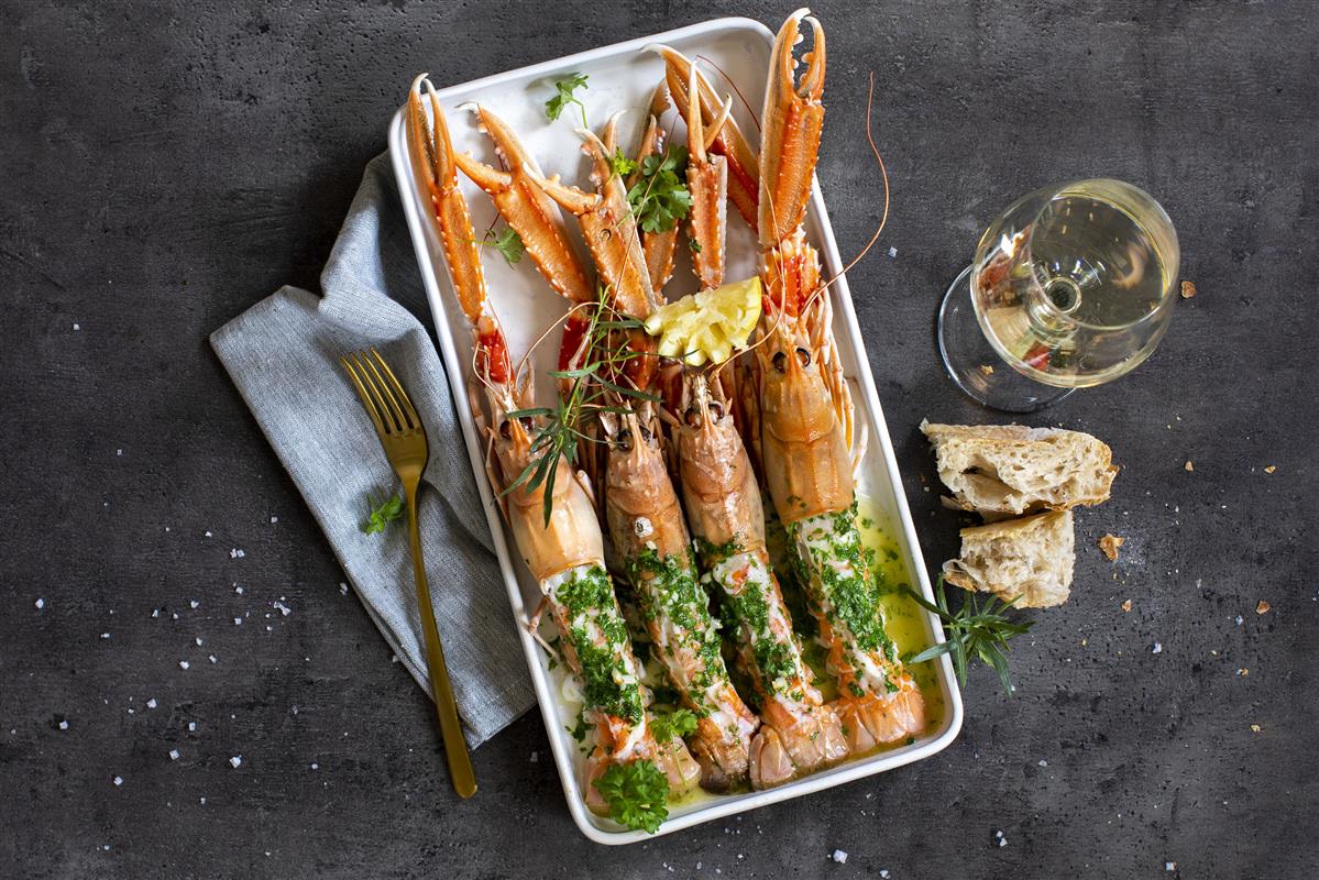 Klargør jomfruhummerne. Rør blødt smør sammen med finthakket hvidløg og friskhakket persille. Gem eventuelt lidt persille til pynt. Fordel hvidløgssmørret i jomfruhummerne - enten ved at fylde det i halerne (hvis kun halerne er rengjorte) eller ved at smøre det ud over hele jomfruhummeren (hvis de er halveret). Gratiner jomfruhummerne i ovnen ved 200°C (alm. ovn) i 8-10 minutter til kødet bliver hvidt, og smørret er smeltet. Gratineringstiden afhænger lidt af størrelsen på jomfruhummerne, og hvorvidt de er halveret. Dryp citronsaft over hummerne. Drys eventuelt med lidt hakket persille og server med godt brød og en grøn salat.