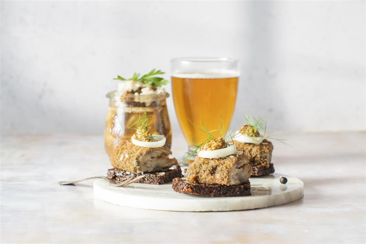 Rist skiver af rugbrød i ovnen til de er sprøde. Køb de stegte sild hos din lokale fiskehandler. Skær rugbrød i små hapsere og anret dem på et fad med stegt sild toppet med løgringe, dild og en lille mundsmag af grov sennep.