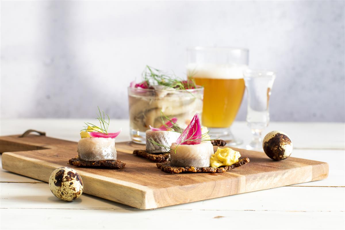 Udstik rugbrød i mindre stykker, eksempelvis runde forme. Steg stykkerne sprøde i smør på en pande. Halver sildefileterne på langs og rul dem sammen. Anret medaljerne på et fad. Top sildene med karrysalat og løgringe. Pynt med lidt karse eller finthakket rødløg.