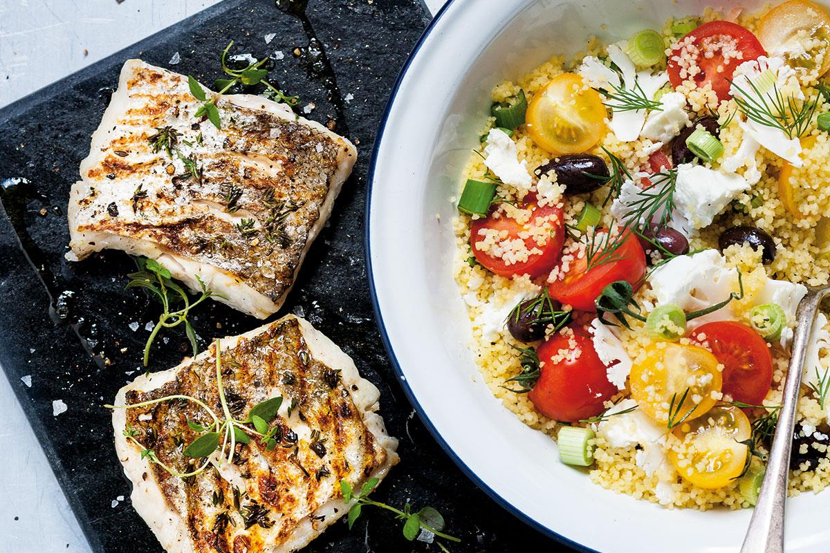 Grill fisken på en varm grillpande eller havegrill i ca. 1,5 minut på hver side og servér den med couscoussen.