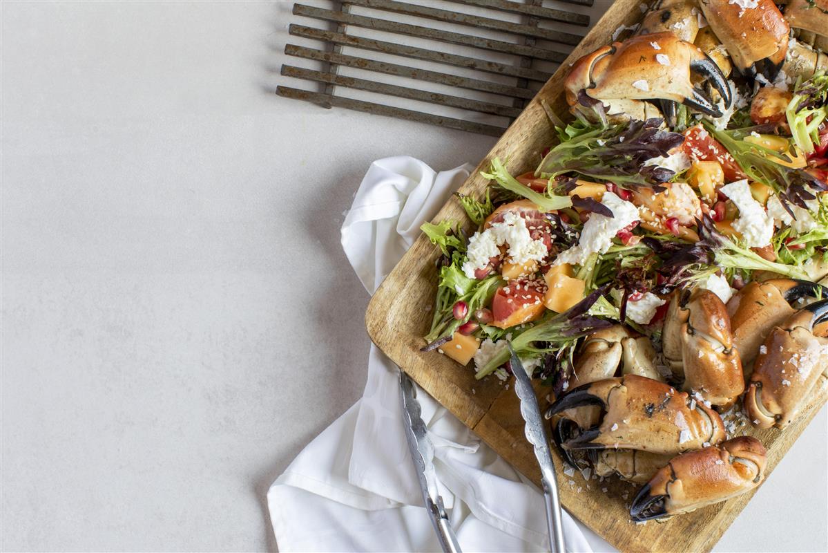 Grilles ved direkte varme i 4-5 minutter på hver side. Anret de grillede krabbekløer på fadet sammen med salaten.